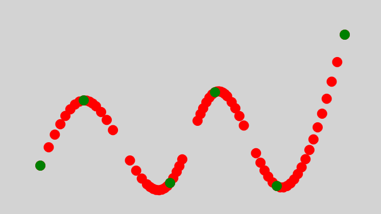 把这些新增点与原数据点,用直接连接起来,就是一条比较平滑的曲线了。同时原数据点也在拟合的曲线上。另外,如果还需要优化下这些线段的平滑,可以使用贝塞尔曲线(见上面贝塞尔的实现)替换直线连接,已经加了很多密集点,绿点不会脱离曲线的。