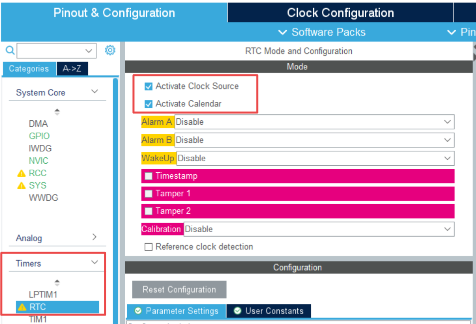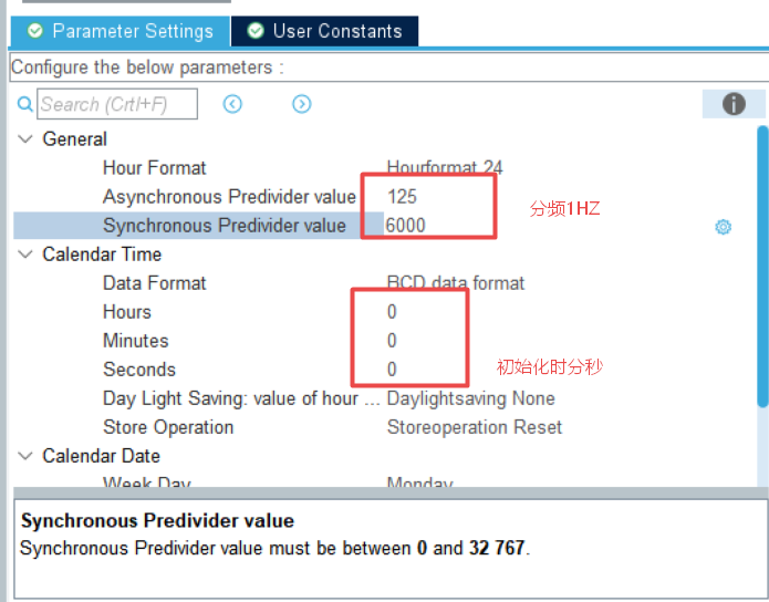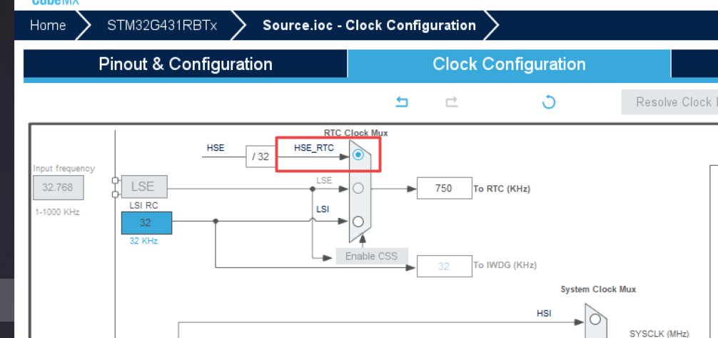 配置时钟树 时钟来自外部晶振(可以看到分频后为750kHZ, 之后还要分频成1HZ)