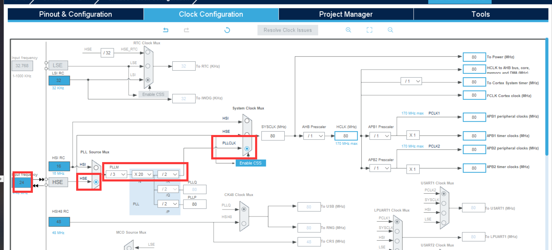 时钟树如下图红框处设置,最后生成的是80MHZ就对了