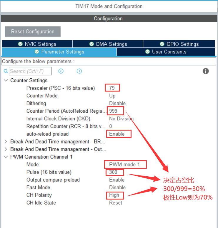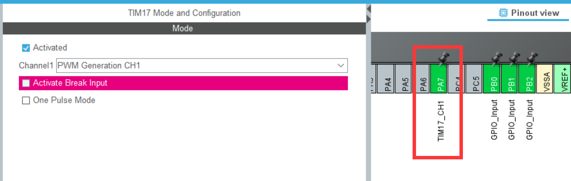 第一路PWM输出, 定时器TIM17通道1, 引脚PA7