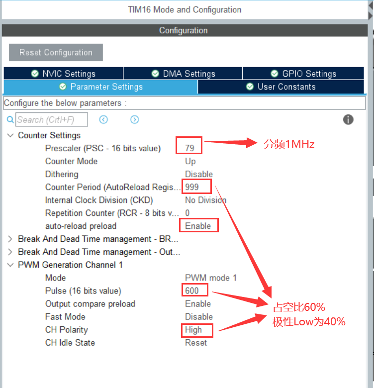第二路PWM输出配置, TIM16通道1, 引脚PA6。配置和第一路一致。