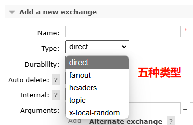 五种交换机类型:direct、fanout、headers、topic、x-local-random