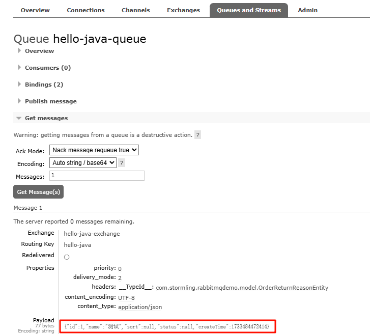 2024-12-06T22:46:37.495+08:00 INFO 15808 --- [ntContainer#0-3] c.s.rabbitmqdemo.handler.OrderMQHandler : 消息体内容:OrderReturnReasonEntity(id=1, name=测试-0, sort=null, status=null, createTime=Fri Dec 06 22:46:37 CST 2024)