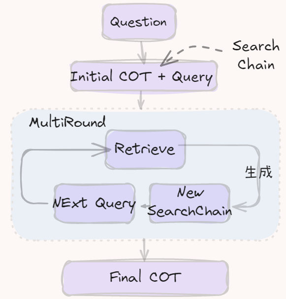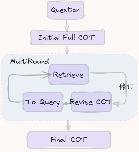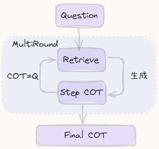 - 直接推理生成:COT是直接基于检索,和前面的推理结果进行继续生成