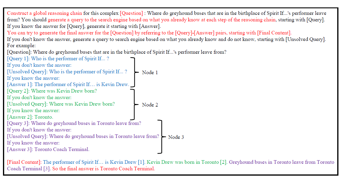 对比前面的IRCOT,Search in the chain会预先生成全局规划,并且规划的步骤中增加了子问题的拆解生成。每一步检索后,都根据检索重新生成新的全局规划。以下是Search in the Chain的实现步骤