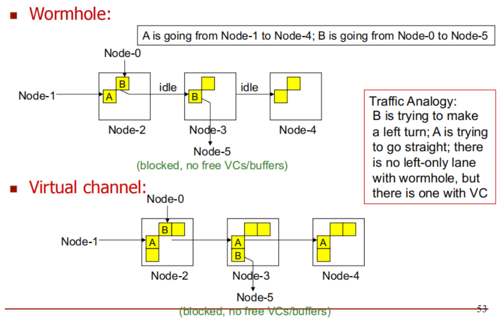 - 缺点: 如果链路拥塞,部分数据包(flits)可能无法前进,造成资源浪费。