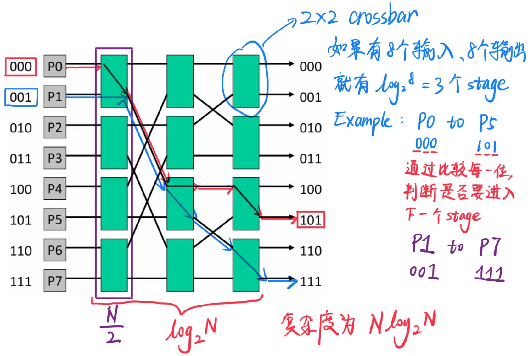 争用增加:P0 – P5 和 P1 – P7 无法同时发生(在交叉开关中是可能的)。