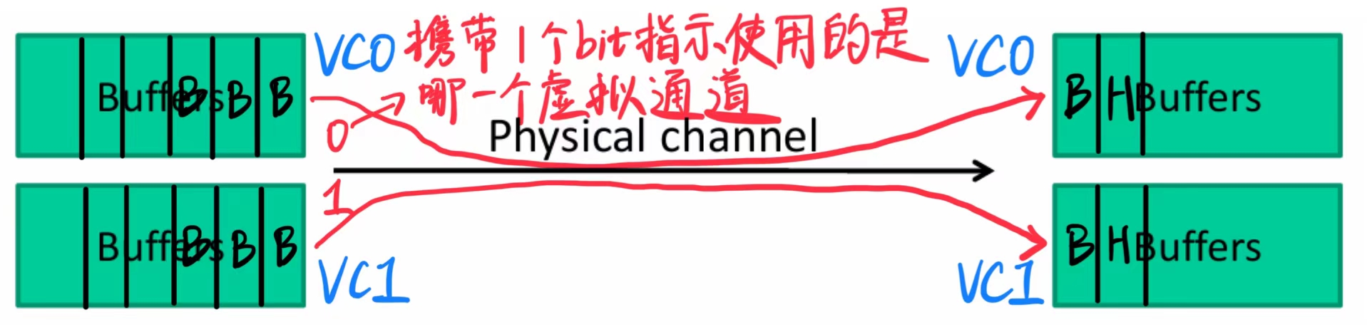 - 由于物理通道可能需要被多个数据流共享,虚拟信道(VC)通过分配多个逻辑通道来解决资源争用问题。