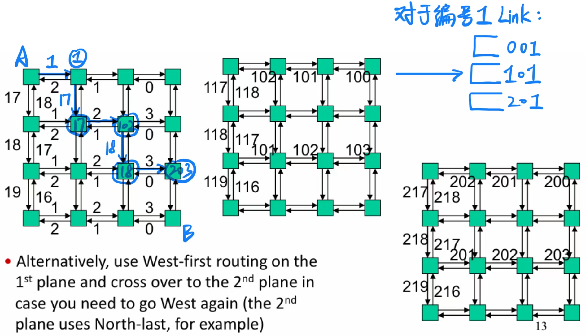 - 如果我们能确保所有数据包的路径都按照边的编号顺序递增(或递减)进行移动,就不会产生循环依赖,从而避免死锁。