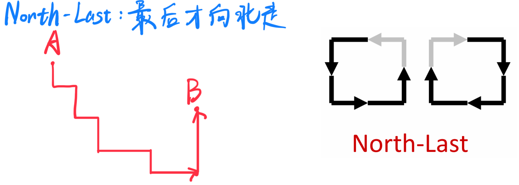 - 如果禁止数据包进行两个特定方向的转弯,就可以有效地消除路径中的循环依赖,从而避免死锁。