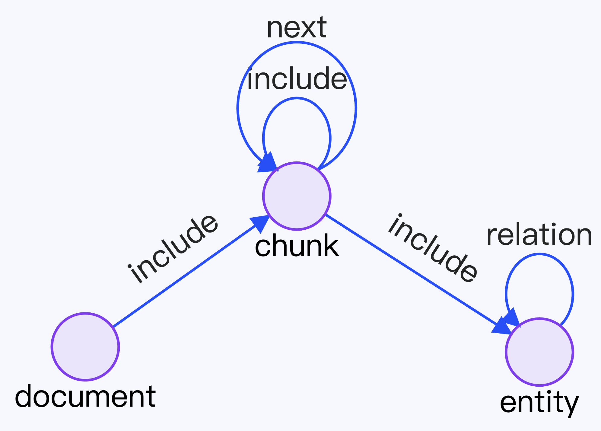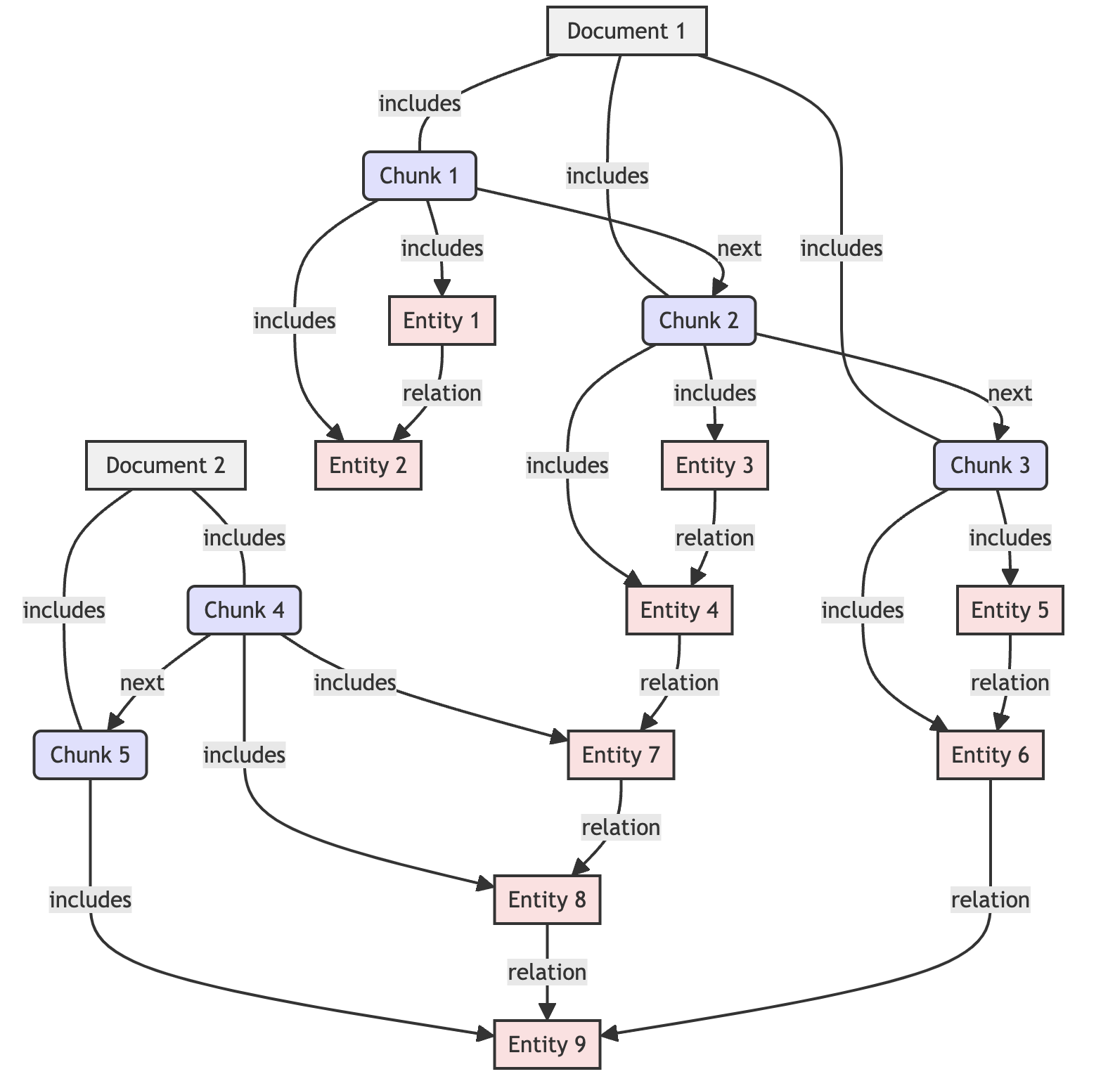 通俗地说,Document 1 就像一本教程的主目录,它通过包含(include)关系连接到不同的章节(Chunk 1、2、3)。每个章节又可以包含(include)更具体的知识点(Entity)。同时,通过 next 关系,我们能清晰地看到学习的推荐顺序。