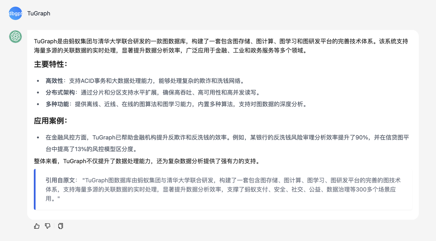 用户询问的是 “TuGraph” 的基本信息。系统通过关键词提取,准确定位到了相关的知识节点。这验证了笔者前面讨论的查询理解机制的有效性。