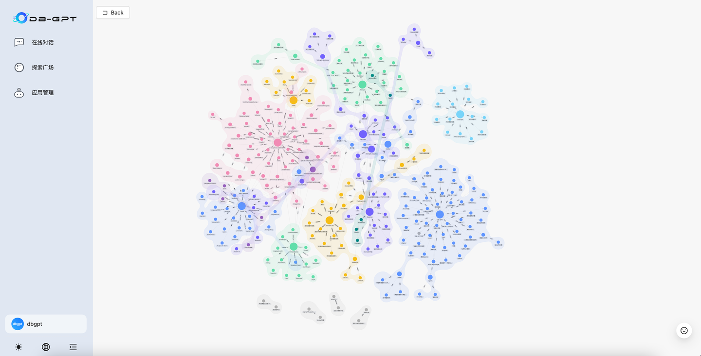 目前,用户可以快速地在 DB-GPT v0.6.2 版本的前端应用中体验到该功能,并且该前端提供了清晰直观的知识图谱可视化图。生成的知识图谱由 AntV G6 引擎驱动渲染。