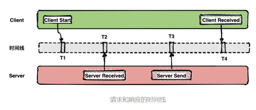 如下面的图表示从客户端调用服务端的一次完整过程。如果要计算一次调用的耗时,只需要将客户端接收的时间点减去客户端开始的时间点,也就是图中时间线上的T4 – T1。