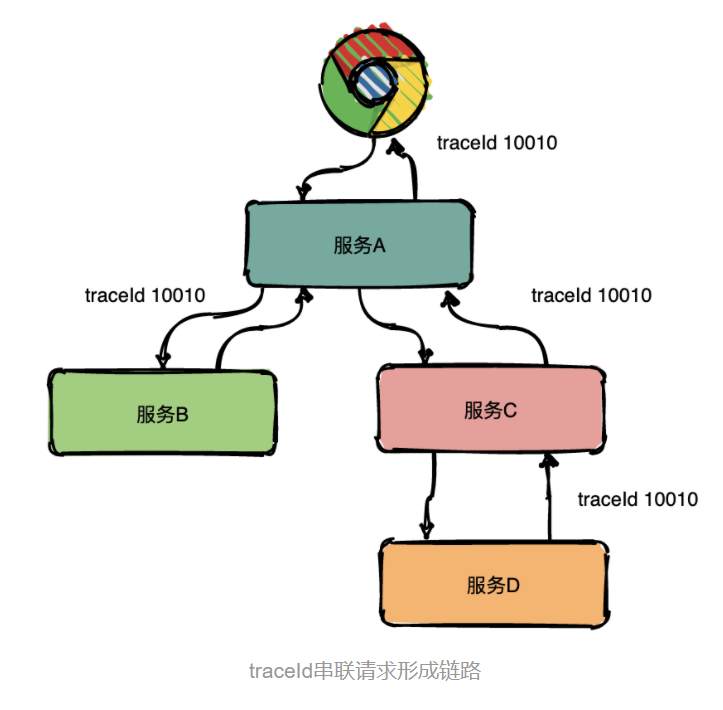 图中一条完整的链路是:chrome -> 服务A -> 服务B -> 服务C -> 服务D -> 服务E -> 服务C -> 服务A -> chrome。