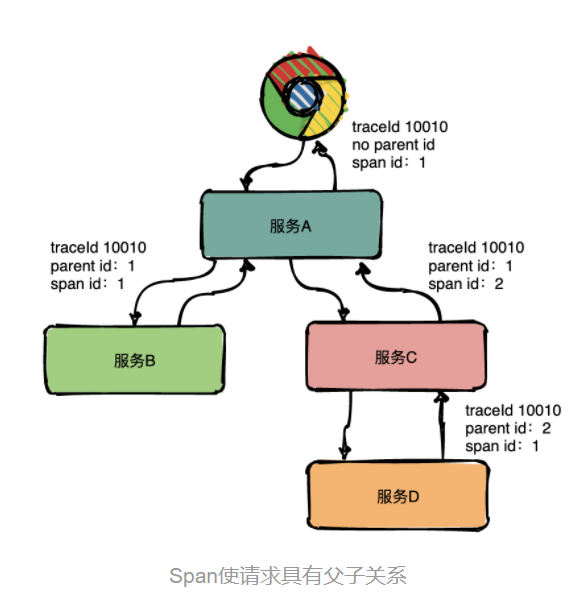 通过唯一的 trace id无法知道先是调用了服务A还是先调用了服务B,因此为了去表达这种父子关系引入了 span 的概念,相同层的 parent id 相同,span id不同,并且 span id 由小到大来表示请求的顺序。