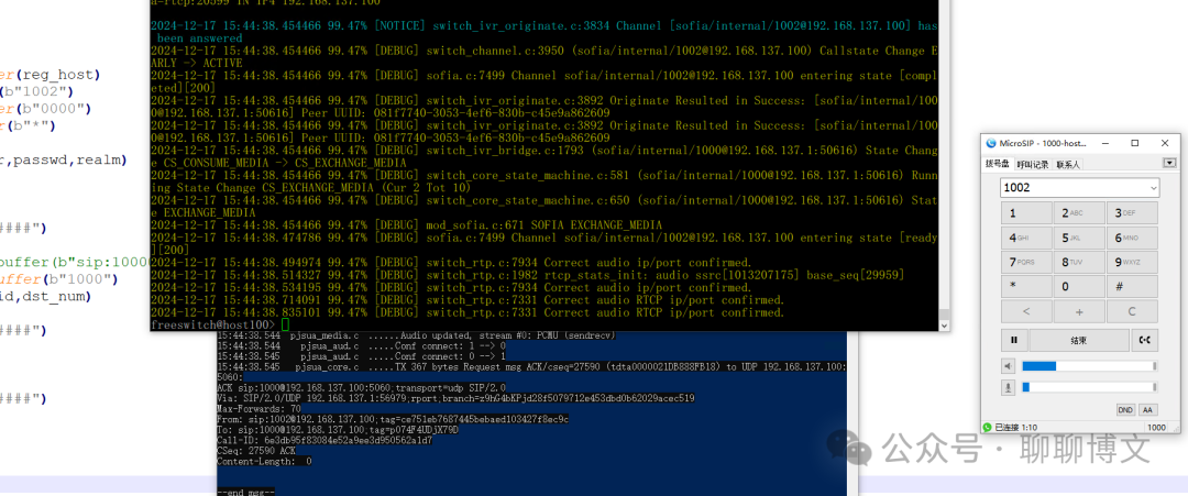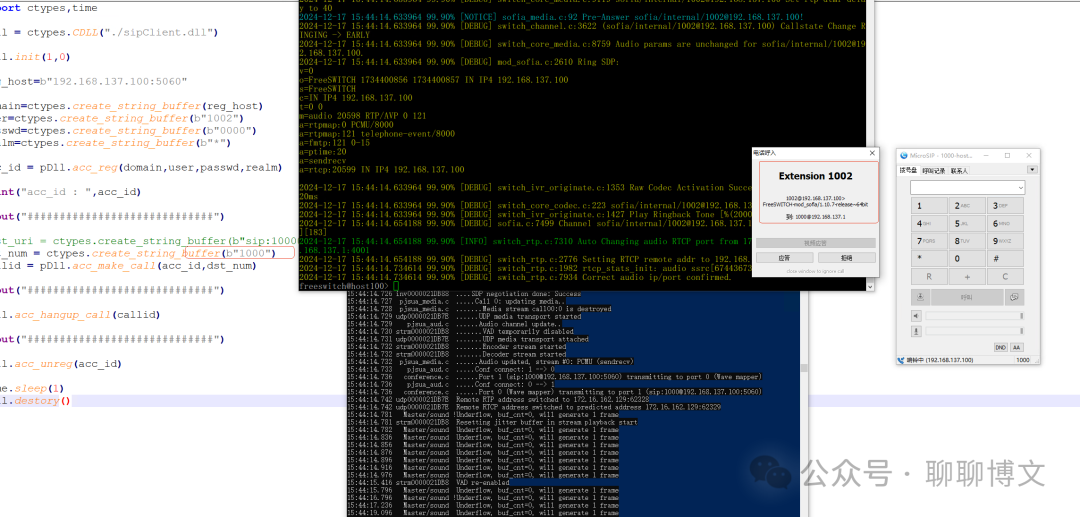 import ctypes,time pDll = ctypes.CDLL("./sipClient.dll") pDll.init(1,0) reg_host=b"192.168.137.100:5060" domain=ctypes.create_string_buffer(reg_host) user=ctypes.create_string_buffer(b"1002") passwd=ctypes.create_string_buffer(b"0000") realm=ctypes.create_string_buffer(b"*") acc_id = pDll.acc_reg(domain,user,passwd,realm) print("acc_id : ",acc_id) input("#############################") #dst_uri = ctypes.create_string_buffer(b"sip:1000@" + reg_host) dst_num = ctypes.create_string_buffer(b"1000") callid = pDll.acc_make_call(acc_id,dst_num) input("#############################") pDll.acc_hangup_call(callid) input("#############################") pDll.acc_unreg(acc_id) time.sleep(1) pDll.destory()
