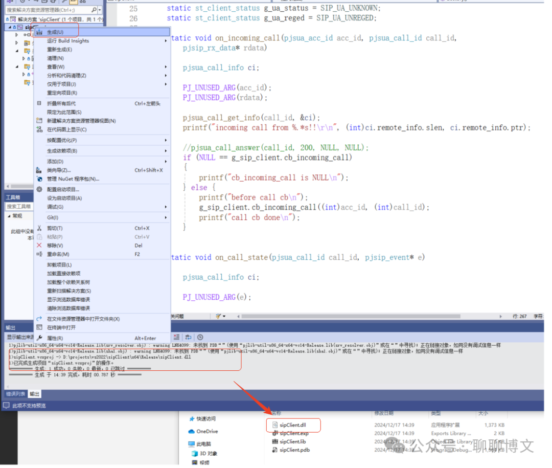 在sipClient工程右键选中“生成”即可进行编译。