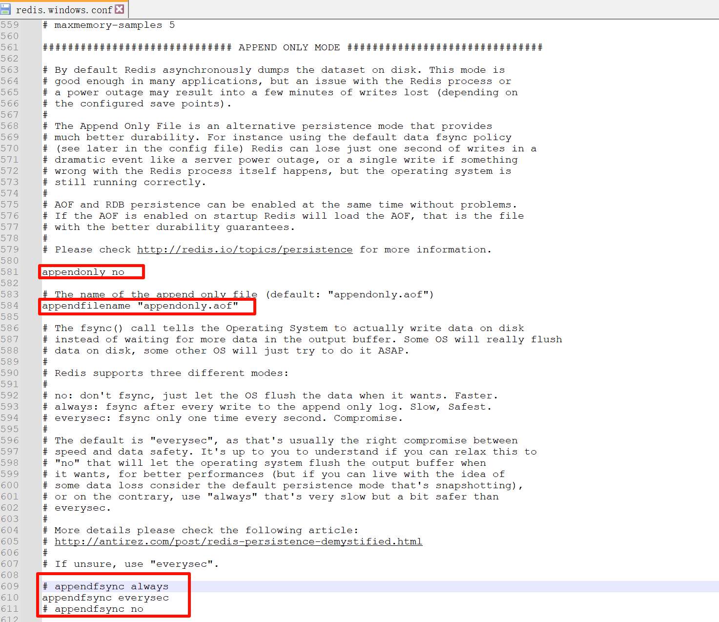 appendonly 配置项设置为yes,表示启用 AOF 持久化。appendonly yes -