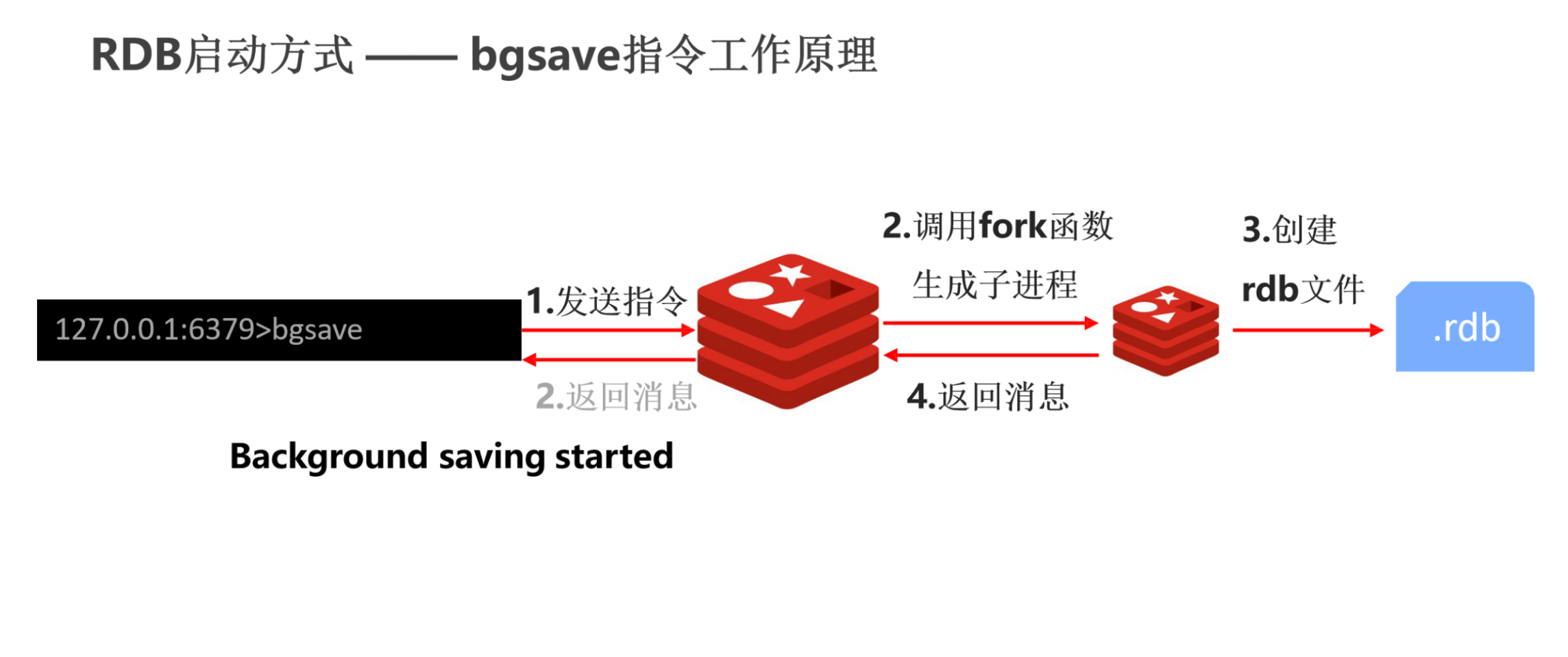 BGSAVE 命令或者根据save 配置自动执行时,它会通过fork() 系统调用创建一个子进程,子进程会将当前内存中的所有数据(整个数据库的内容)写入一个临时的 RDB 文件。 - 快照的写入是一次性操作,不会中途停止,也没有增量更新。
