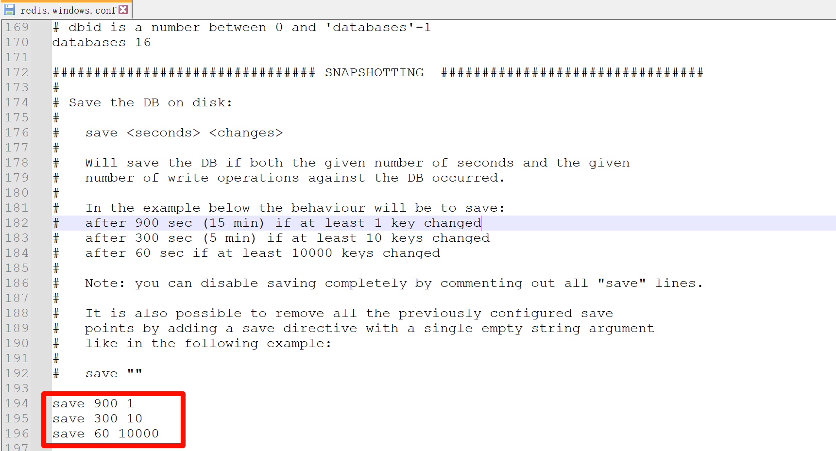 save 900 1 # 900秒(15分钟)内至少有1次写操作