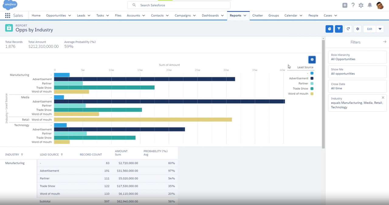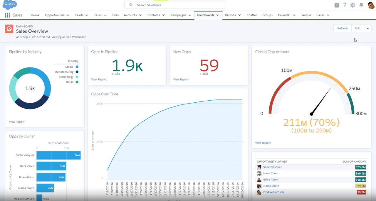 Salesforce 提供了成熟的 报告与仪表盘 功能,帮助用户快速展示和分析业务数据:
