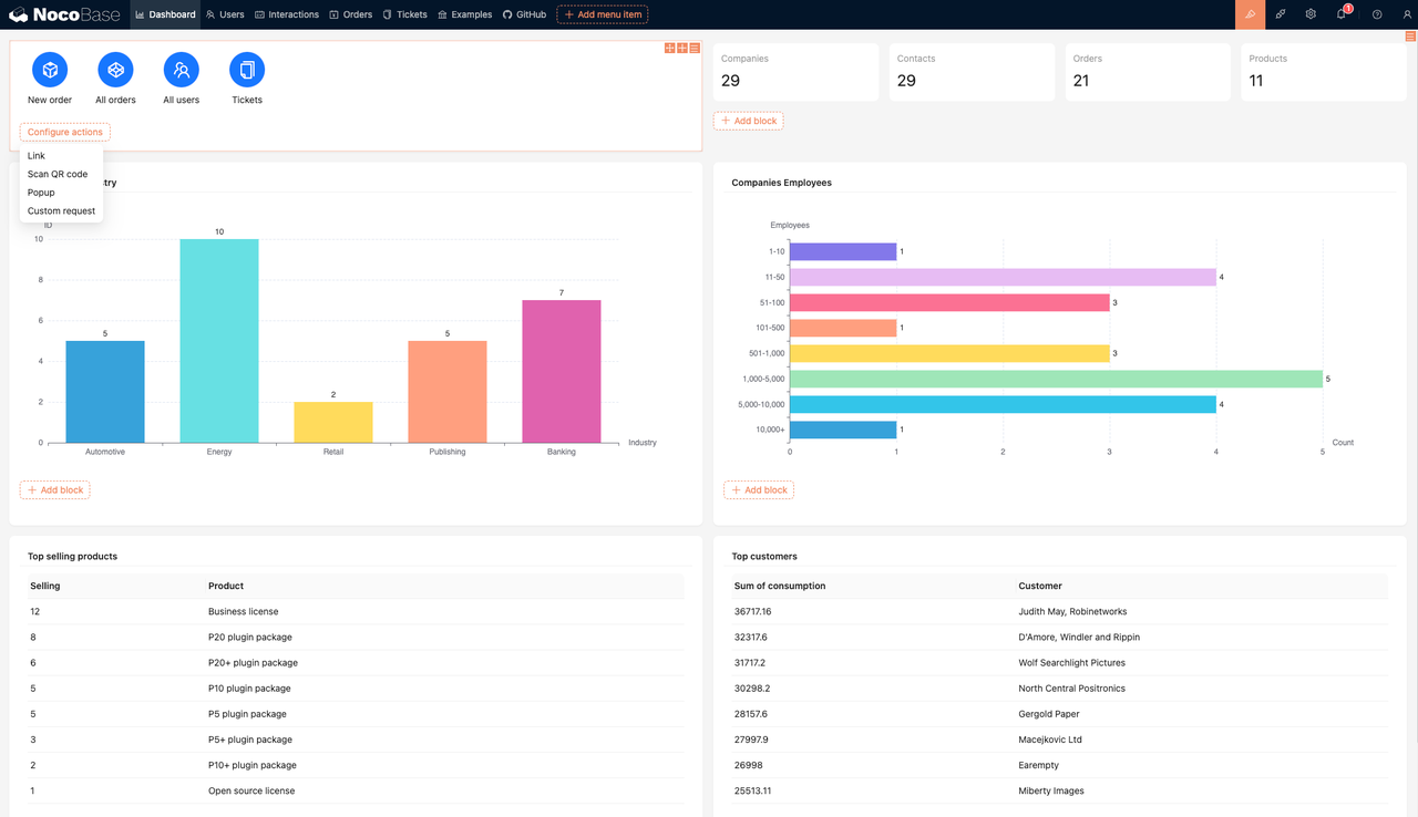 在实际场景中,NocoBase 的开放性使其不仅仅局限于标准化的 CRM 系统。许多大型企业通过 NocoBase 定制行业特定的解决方案,如集成项目管理、销售绩效分析、售后服务流程等,形成高度匹配业务需求的工具。
