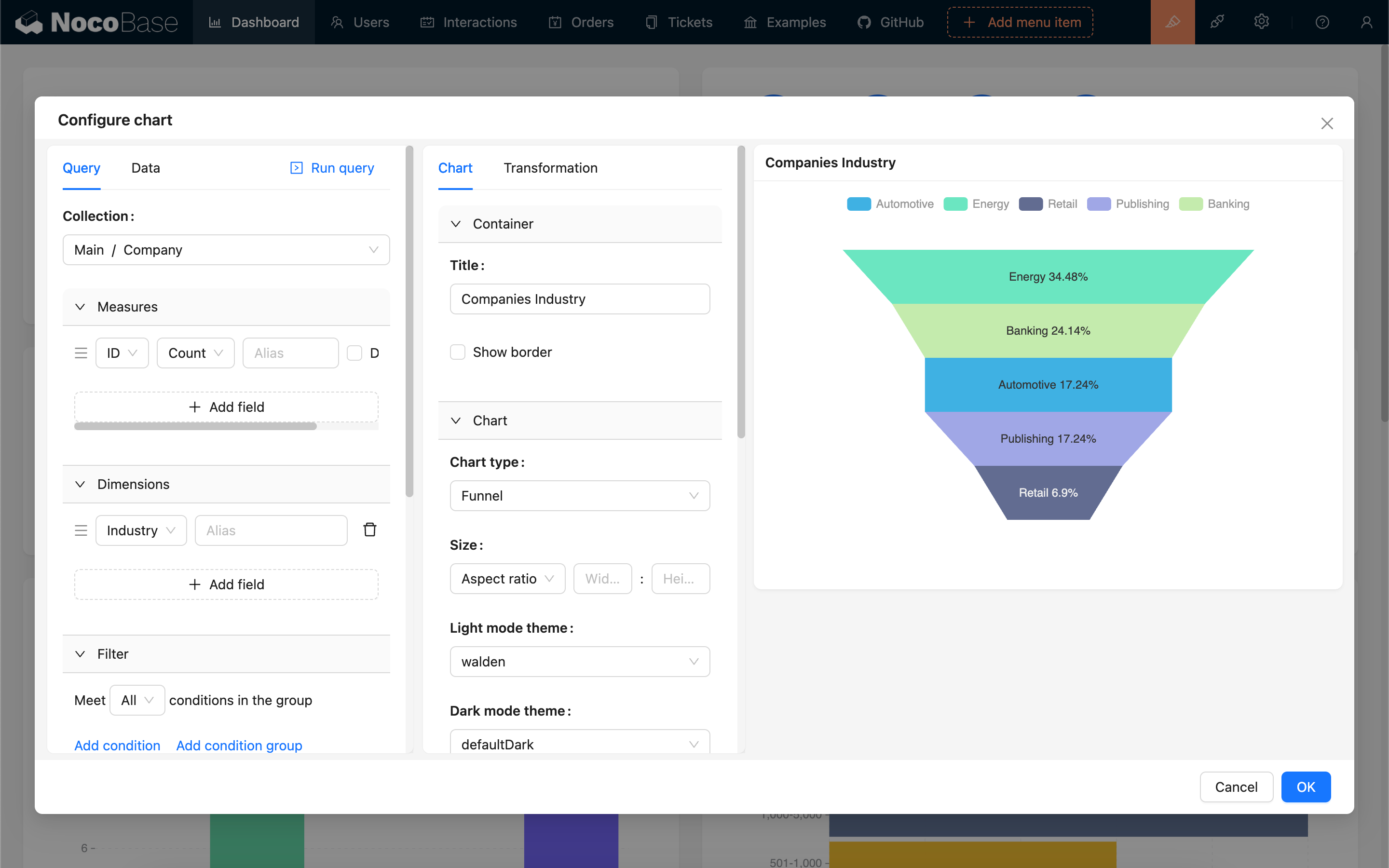 NocoBase 的数据可视化强调高自由度与灵活性,用户不仅可以选择数据展示的形式,还能深度自定义分析逻辑。