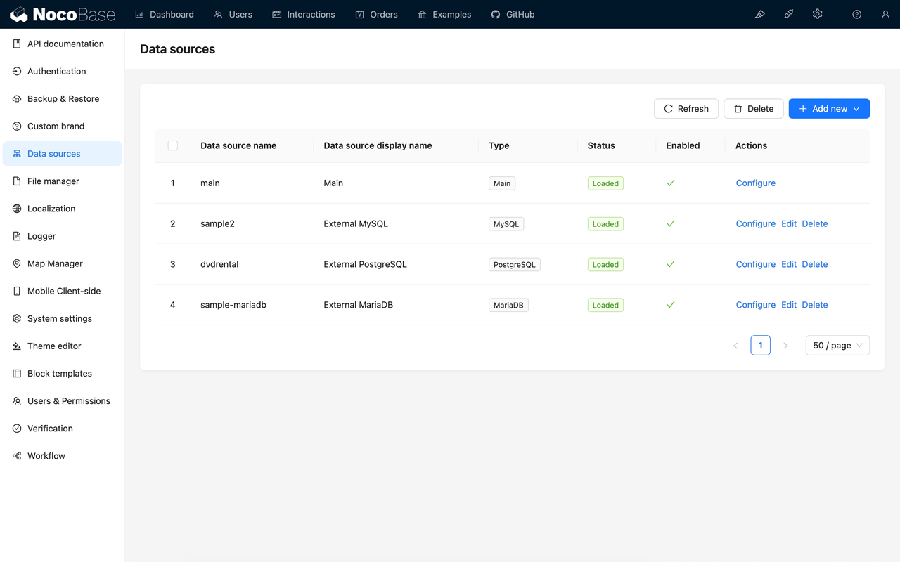 NocoBase 支持多种数据源对接,帮助企业快速实现系统集成: