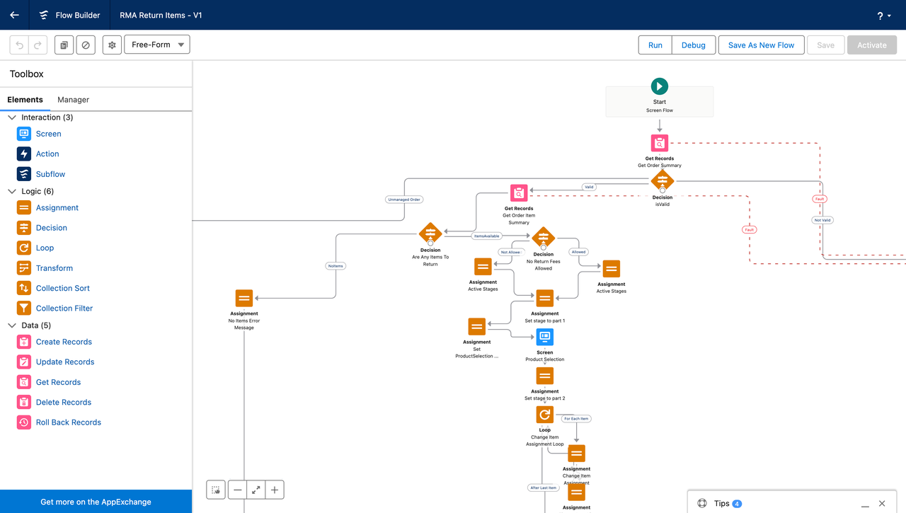 - Flow Builder:一个直观的图形化界面,用户可以在其中创建和管理流程,包括屏幕流、记录触发流和自动启动流等。