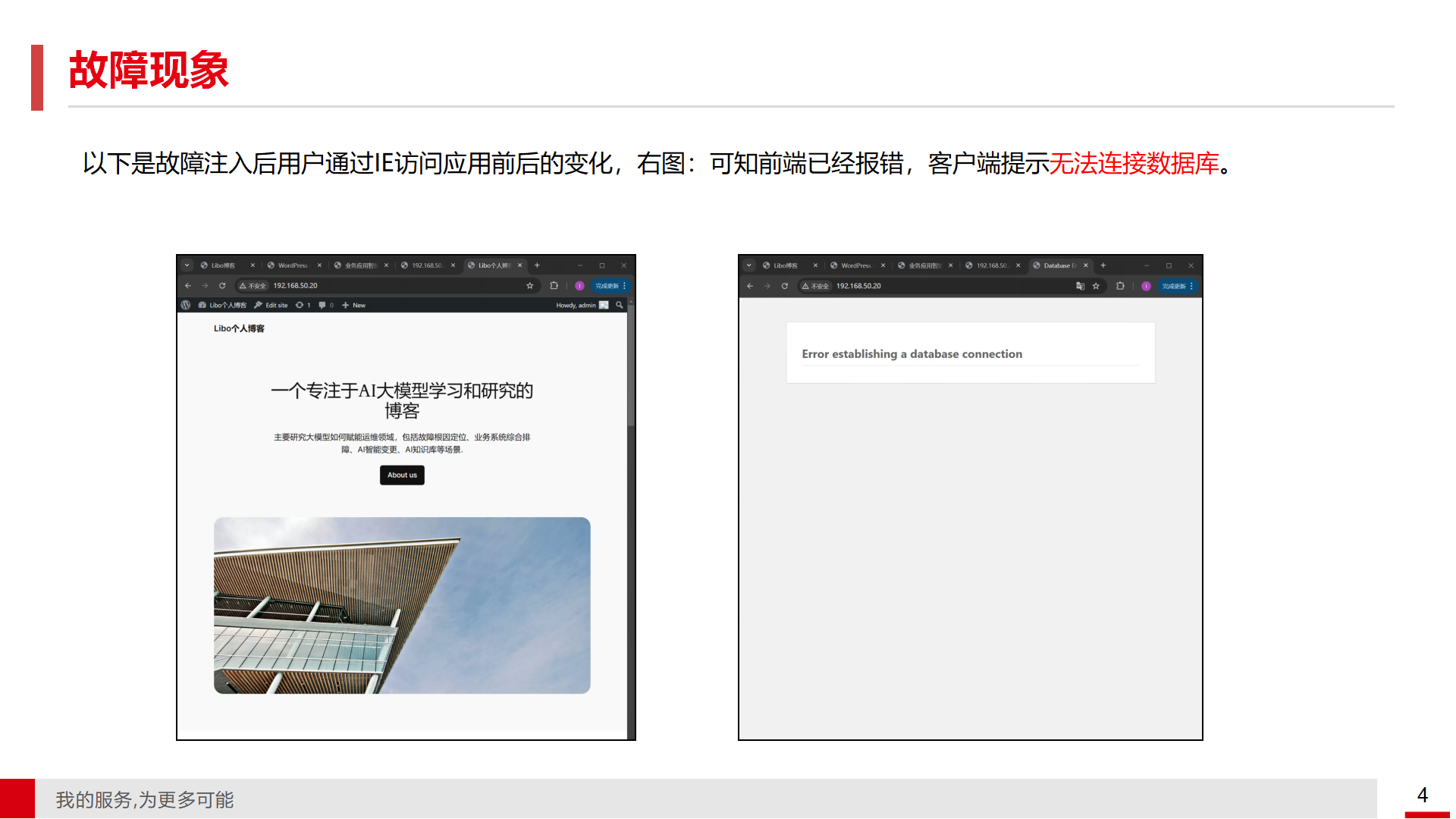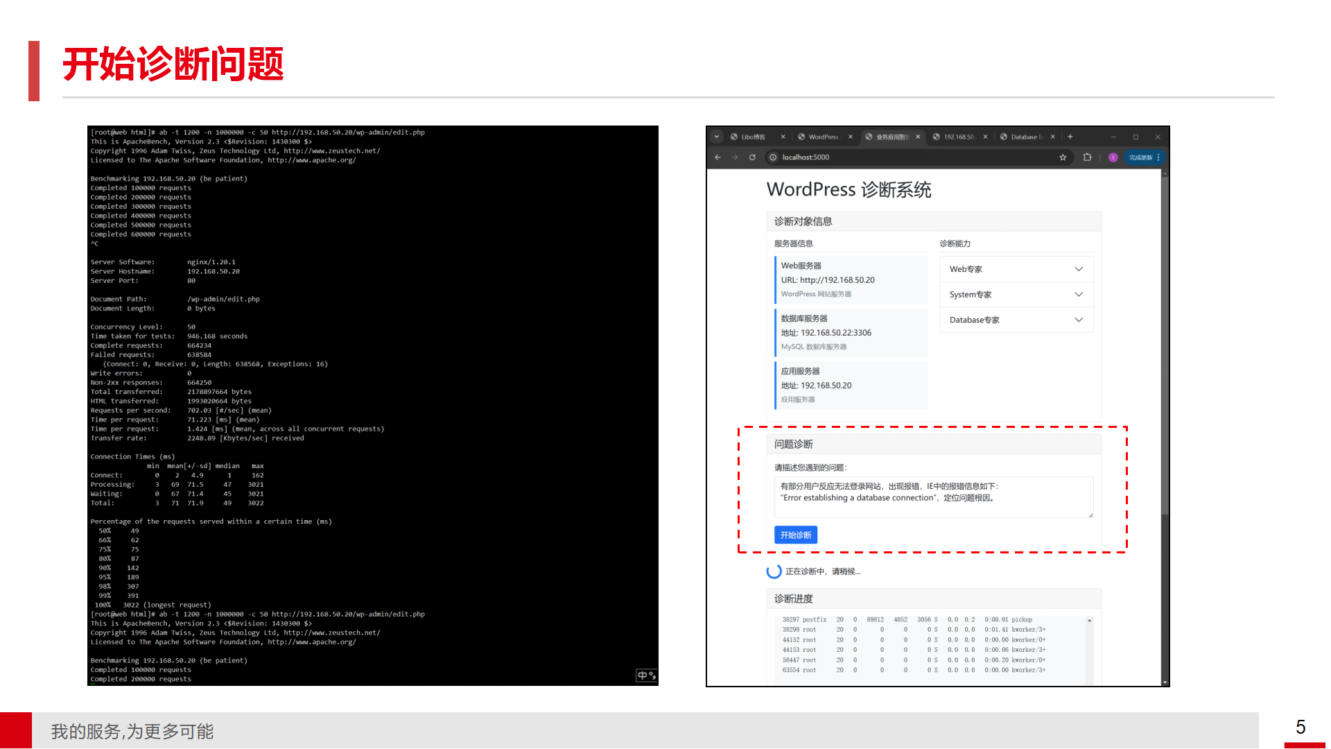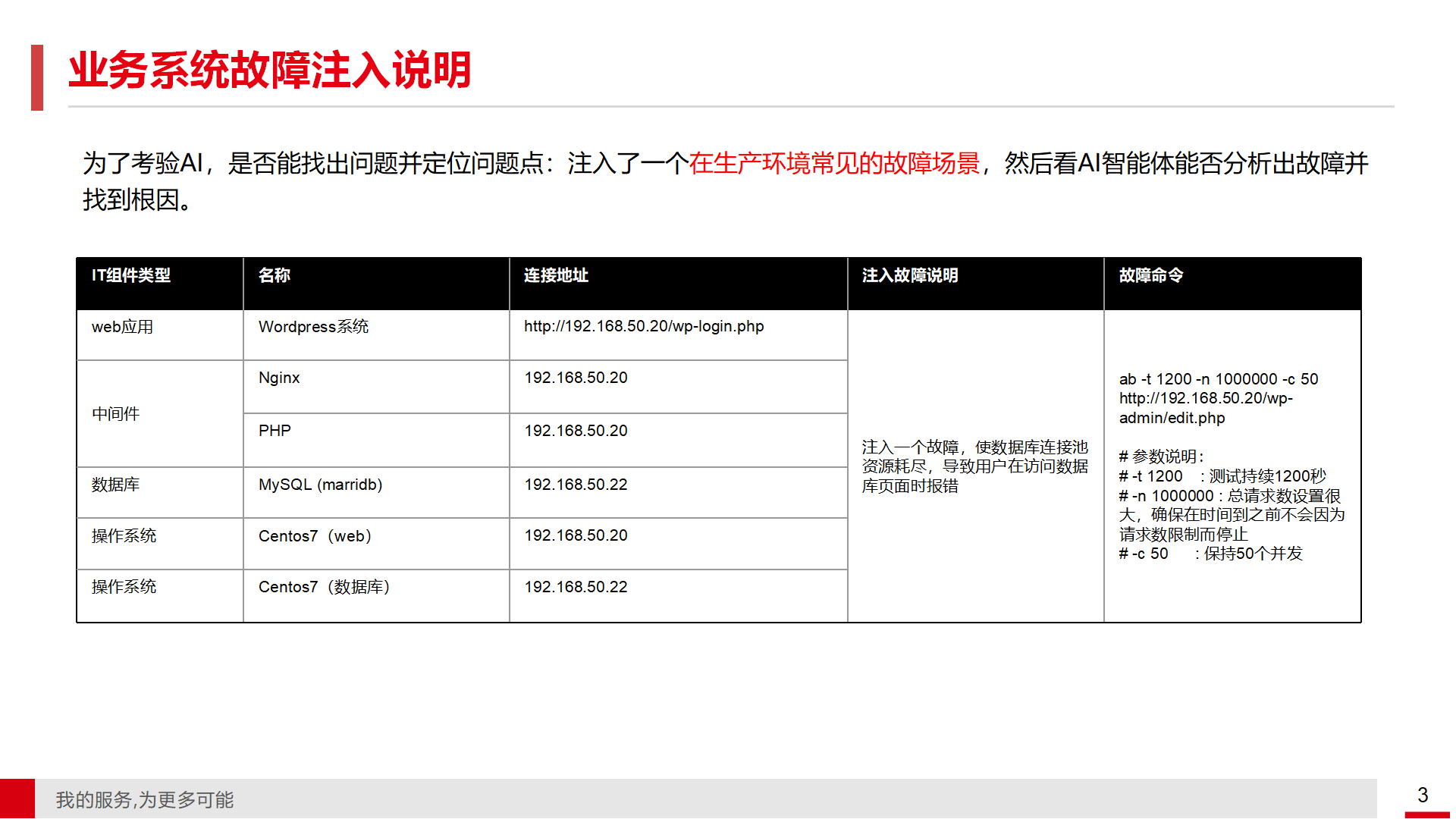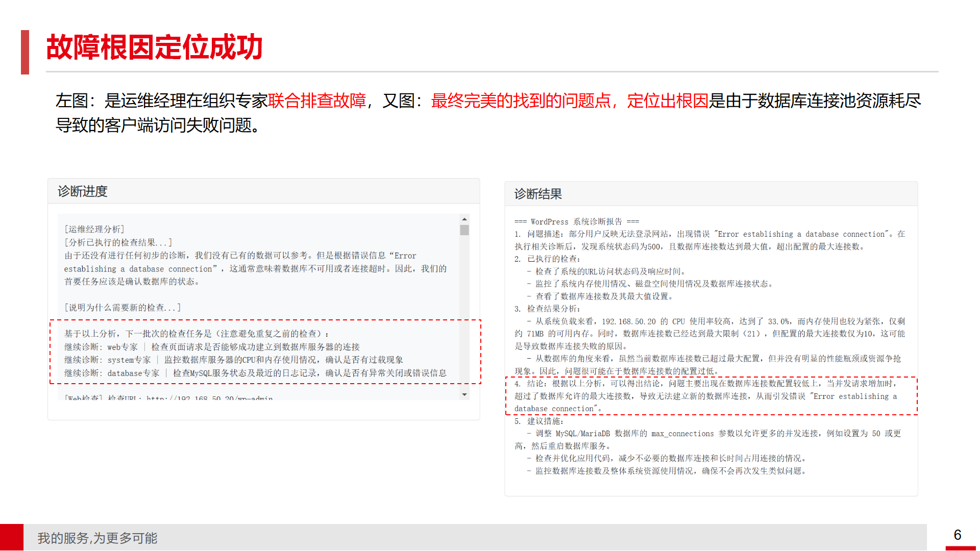 • 故障环境与诊断过程展示 会议中展示了一个博客系统的部署环境,包括前端使用nginx和PHP,中间件使用MySQL,后端服务器为两台渗透OS 7.9。通过注入数据库连接资源耗尽的故障,模拟了前端用户访问异常的情况。运维经理根据用户反馈的问题,协调各领域专家进行初步检查,包括Web连接、系统资源使用情况、数据库状态与日志等。初步检查结果显示,问题可能源于数据库连接数配置过低,无法支持当前的并发请求量。