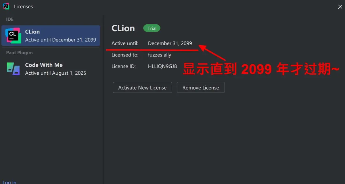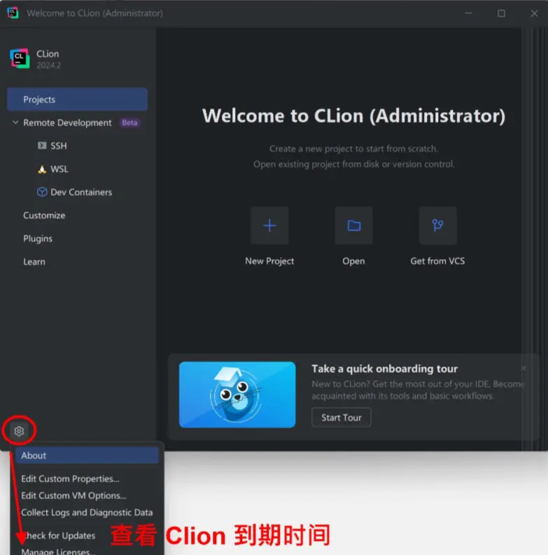 进入 Clion 中后,点击左下方 小齿轮 | Manage Licenses , 即可查看 DataGrip 的激活到期时间: