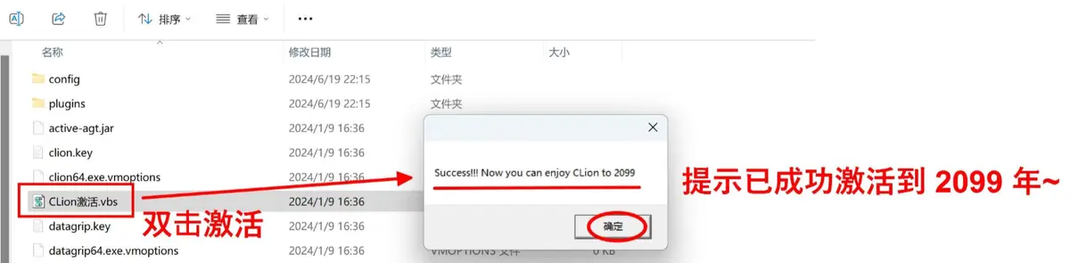 进入到解压后的文件夹 /win2020-2024 中,双击,若提示 Success!!! Now you can enjoy Pycharm to 2099 , 则表示激活成功啦~