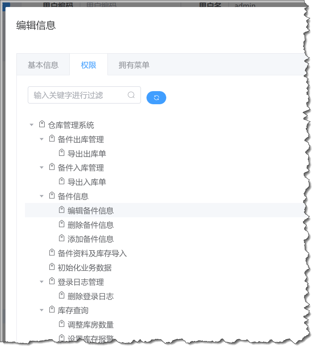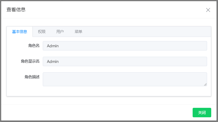 另外用户信息和角色信息类似,也需要展示复杂的相关信息,用户本身拥有的权限功能点和拥有的菜单,如下界面所示。