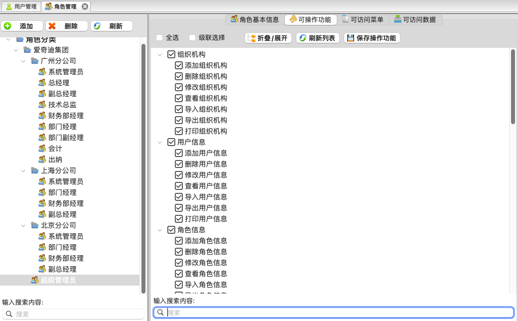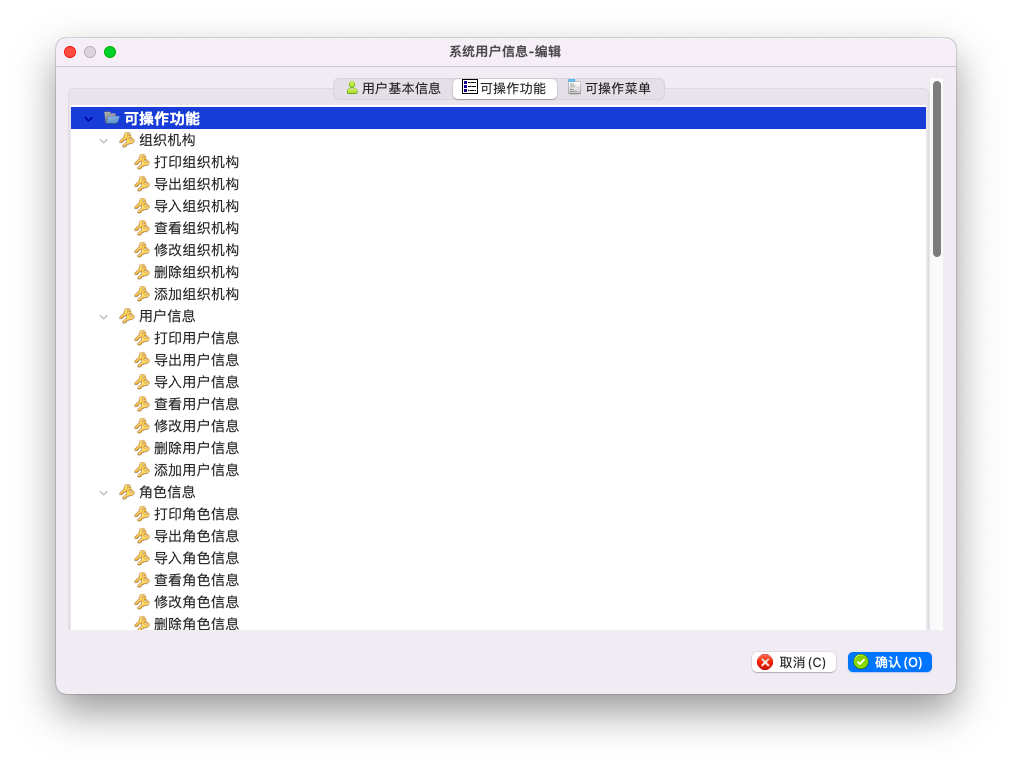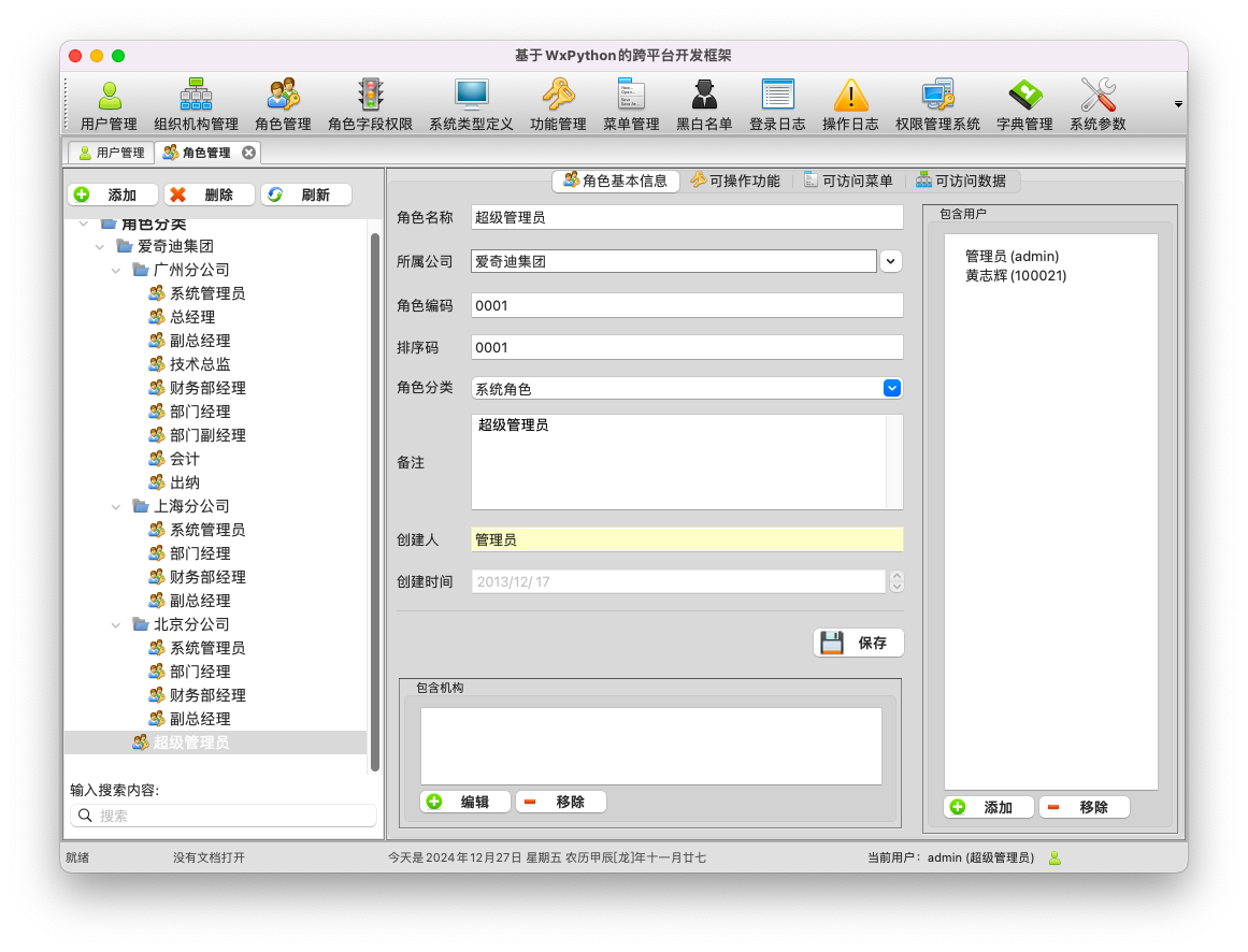 在WxPython的项目中,角色信息的展示也是类似的多选项卡来实现分来展示的。其中包括:角色基本信息、可操作功能、可访问菜单、可访问数据等等内容。如下界面所示。