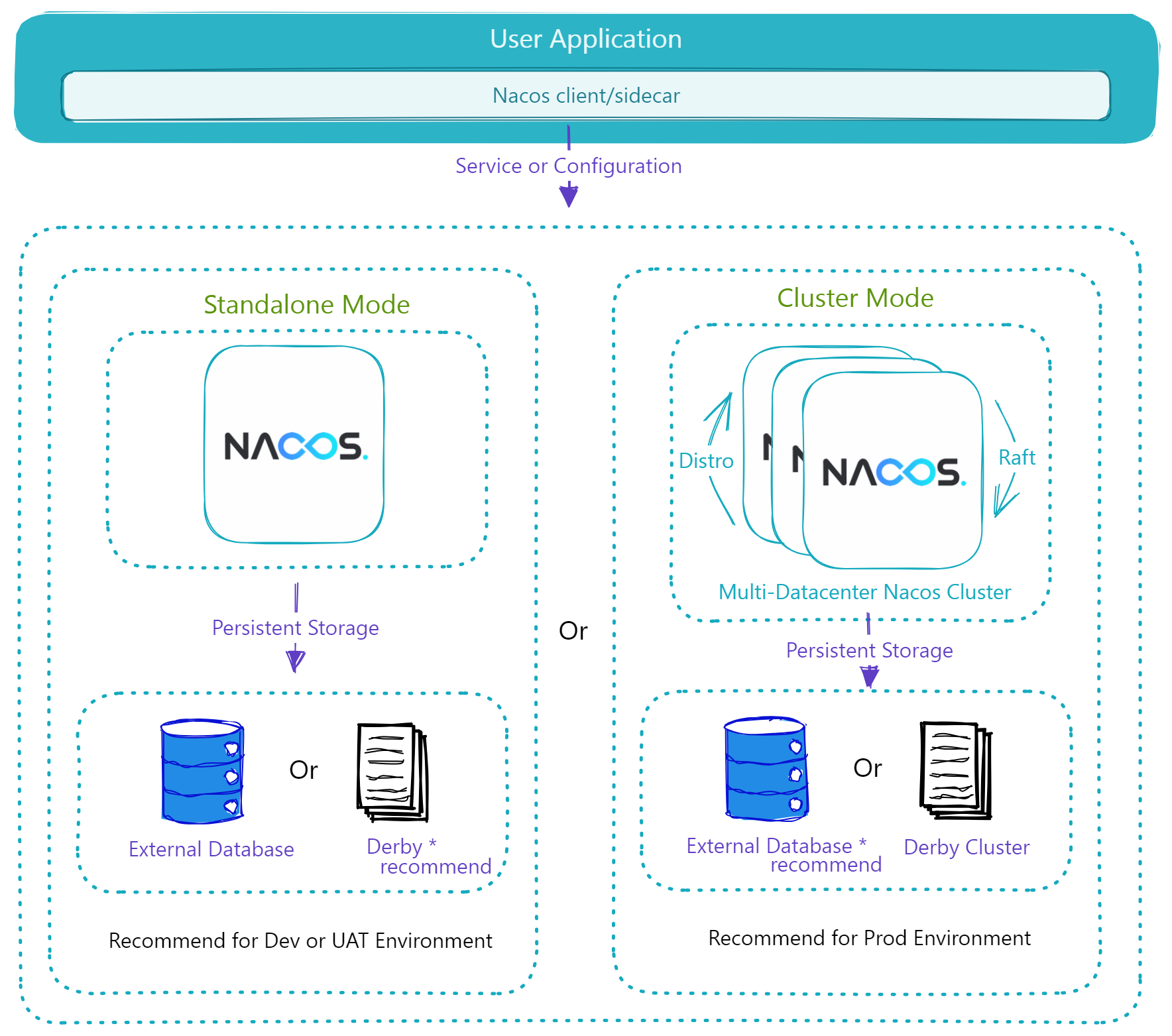 单机模式又称单例模式, 拥有所有Nacos的功能及特性,具有极易部署、快速启动等优点。但无法与其他节点组成集群,无法在节点或网络故障时提供高可用能力。单机模式同样可以使用内置Derby数据库(默认)和外置数据库进行存储。