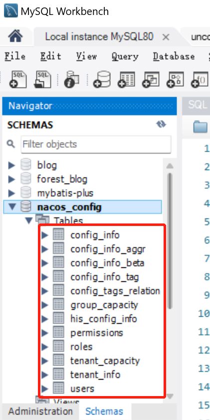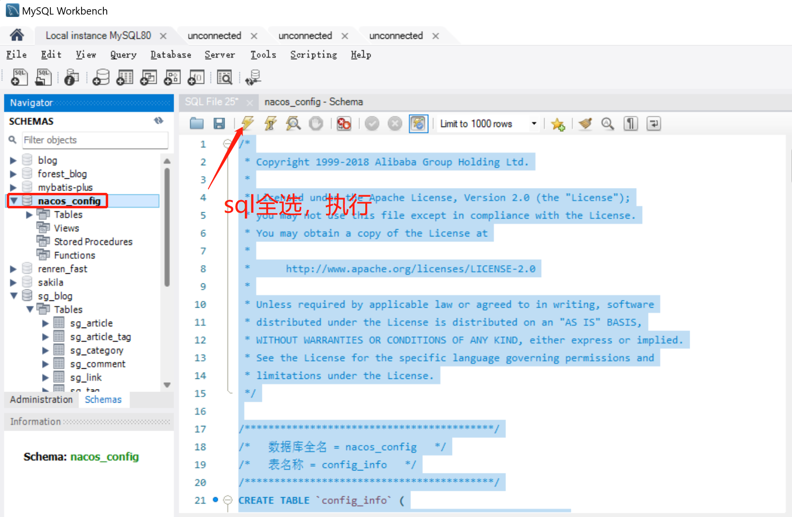 打开nacos中conf文件夹,复制nacos-mysql.sql中的sql语句,在mysql中执行