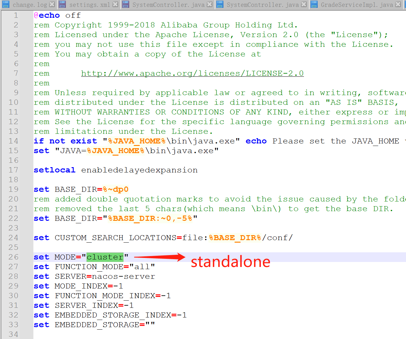 到/bin/startup.cmd脚本,然后配置单机模式:set MODE=”standalone”,保存后双击即可运行