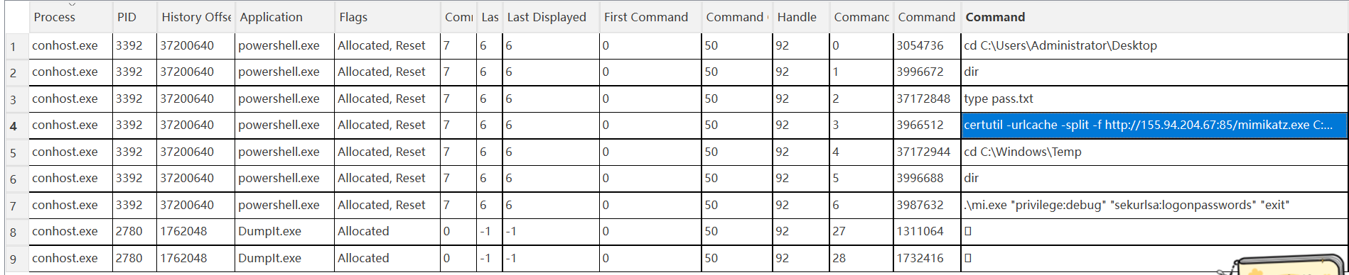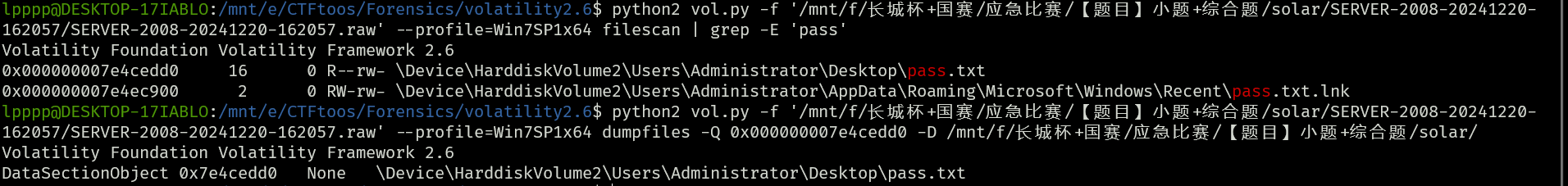 我们在题目 2 中发现 type pass.txt 这个命令,然后我们 找到,pass 文件使用 dumpfiles 插件导出