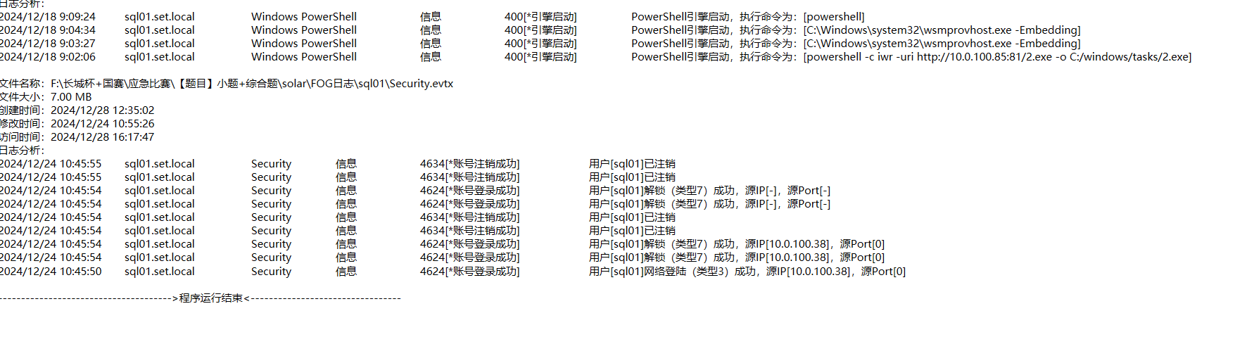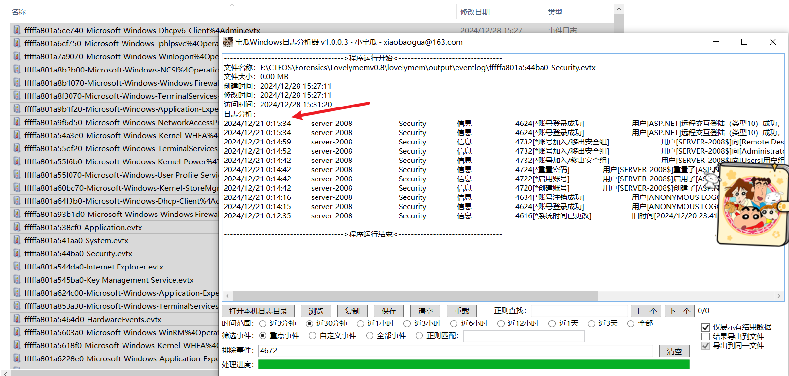 找到登入的时间,我们去分析一下日志文件,先把日志文件都导出来利用 MemProcFS 这个工具,然后直接使用日志文件分析工具进行分析,全拖进去就行