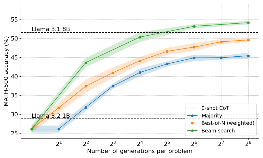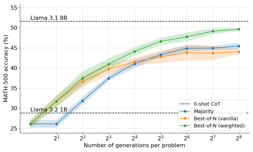 我们为每个提示生成 1 到 256 个补全,以测试不同的计算预算下的每种搜索策略的表现,并使用五个随机种子分别运行每个实验以估计其性能方差。你可以在 此处 找到我们使用的模型和数据集。