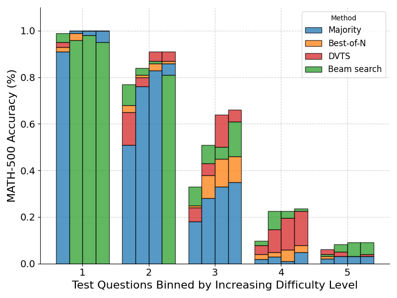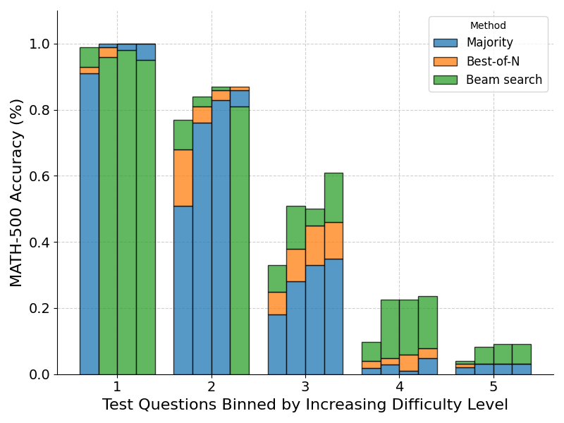 尽管总的来说,波束搜索显然比拔萃法或多数投票表现更好,但 DeepMind 论文表明,每种策略都有其舒适区,具体取决于问题难度和推理时的计算预算。