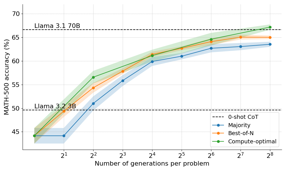 那么计算最优缩放实际效果如何呢?参见下图,如果你给够“思考时间”,小型的 1B 和 3B Llama Instruct 模型在颇具挑战性的 MATH-500 基准测试中的表现优于比其大得多的 8B 和 70B 大哥大姐 🤯: