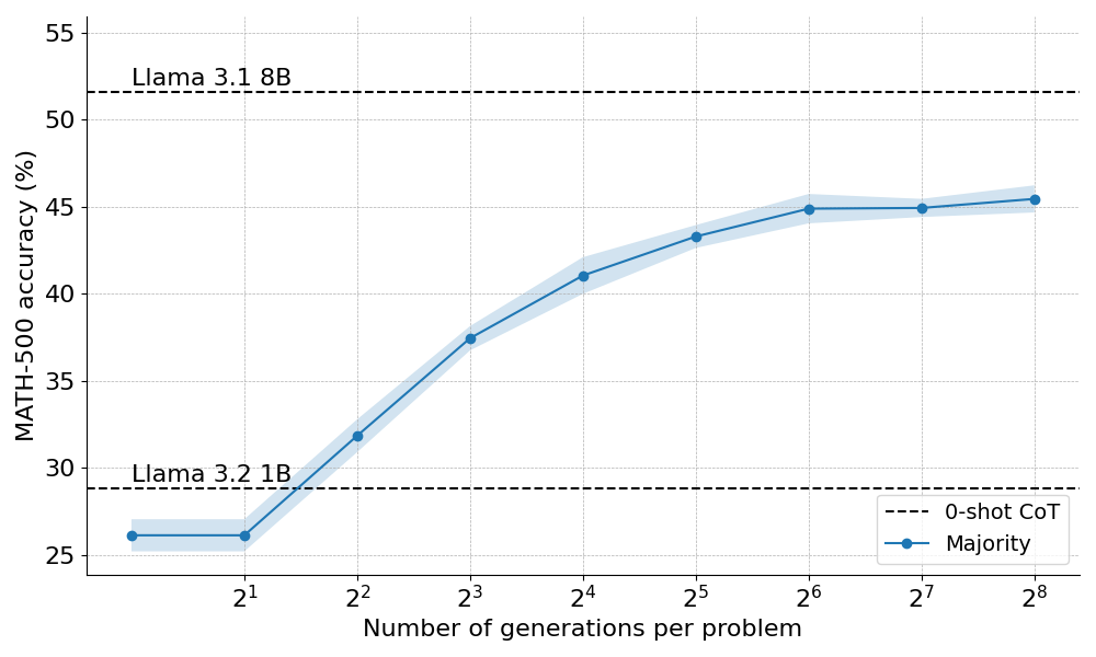 以下是多数投票策略在 Llama 3.2 1B Instruct 上的表现: