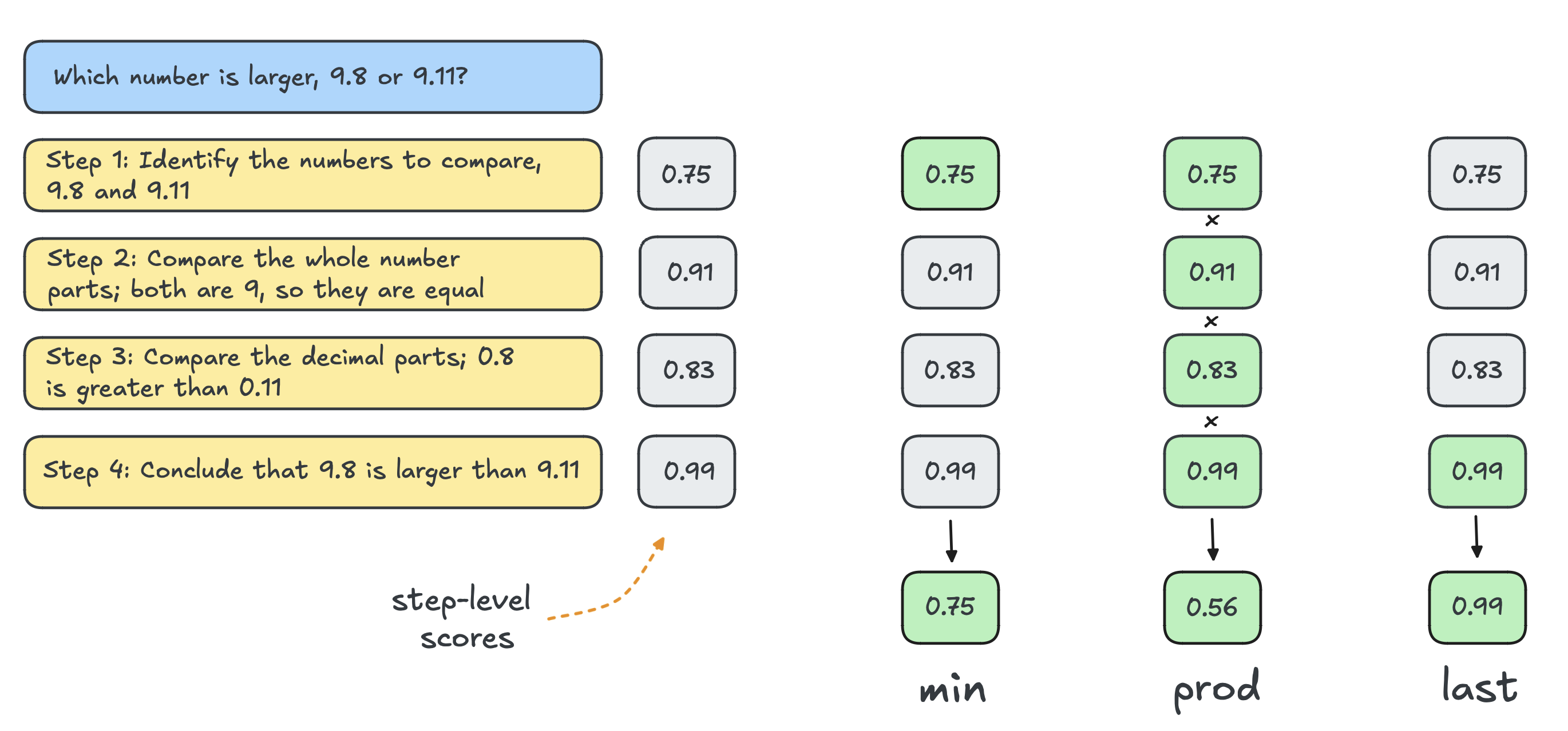 - 最终分: 使用最后一步的得分。该分数包含所有先前步骤的累积信息,因此可将 PRM 等效视为能够对部分解决方案进行评分的 ORM。