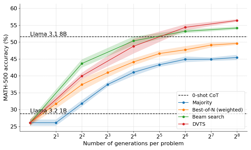 如下所示,结果相当惊人: 在 \(N=4\) 的推理时预算下,波束搜索的精度与拔萃法在 \(N=16\) 时的精度相同,即计算效率提高了 4 倍!此外,在 \(N=32\) 时,波束搜索与 Llama 3.1 8B 的性能相当。考虑到计算机专业的博士生的数学平均成绩约为 40%,因此近 55% 的得分对 1B 模型来讲相当不错了 !