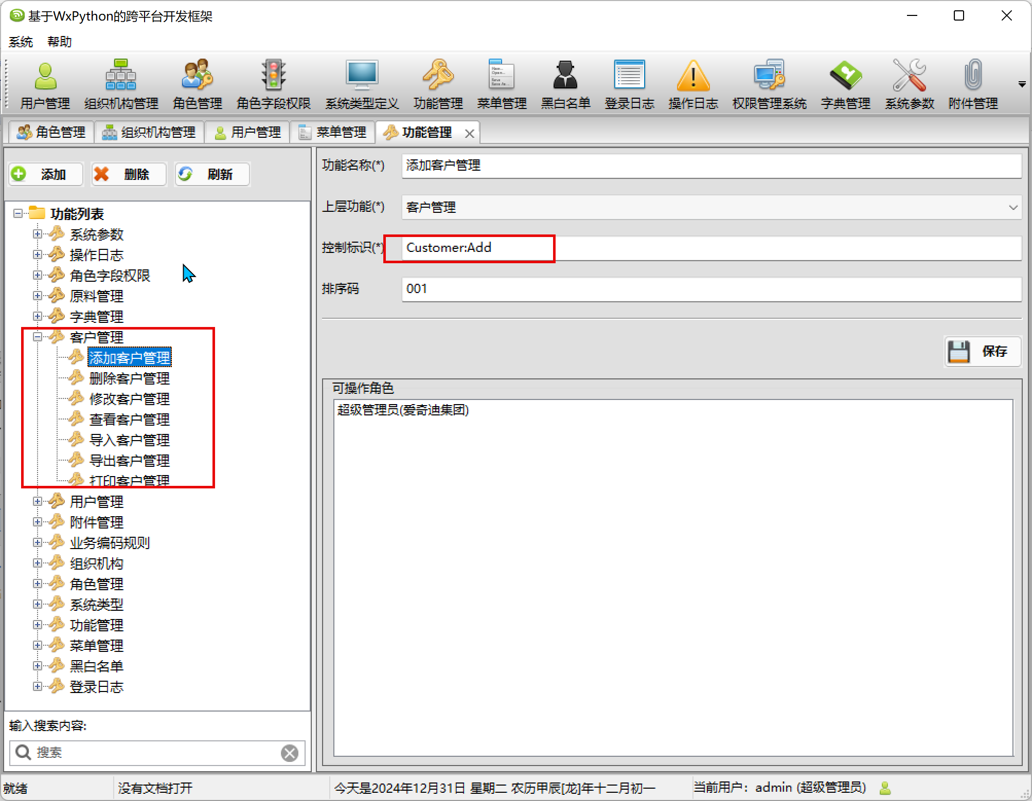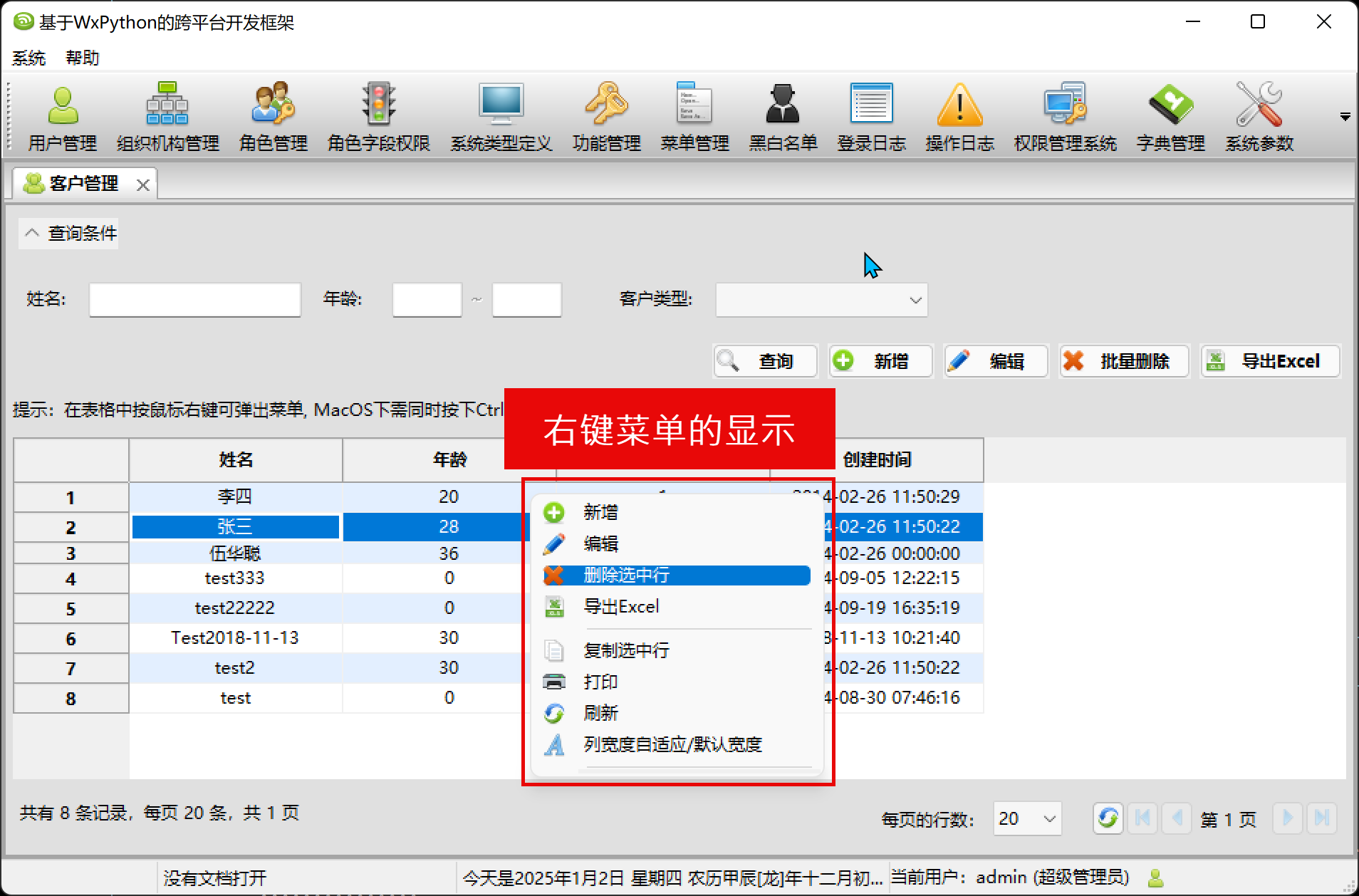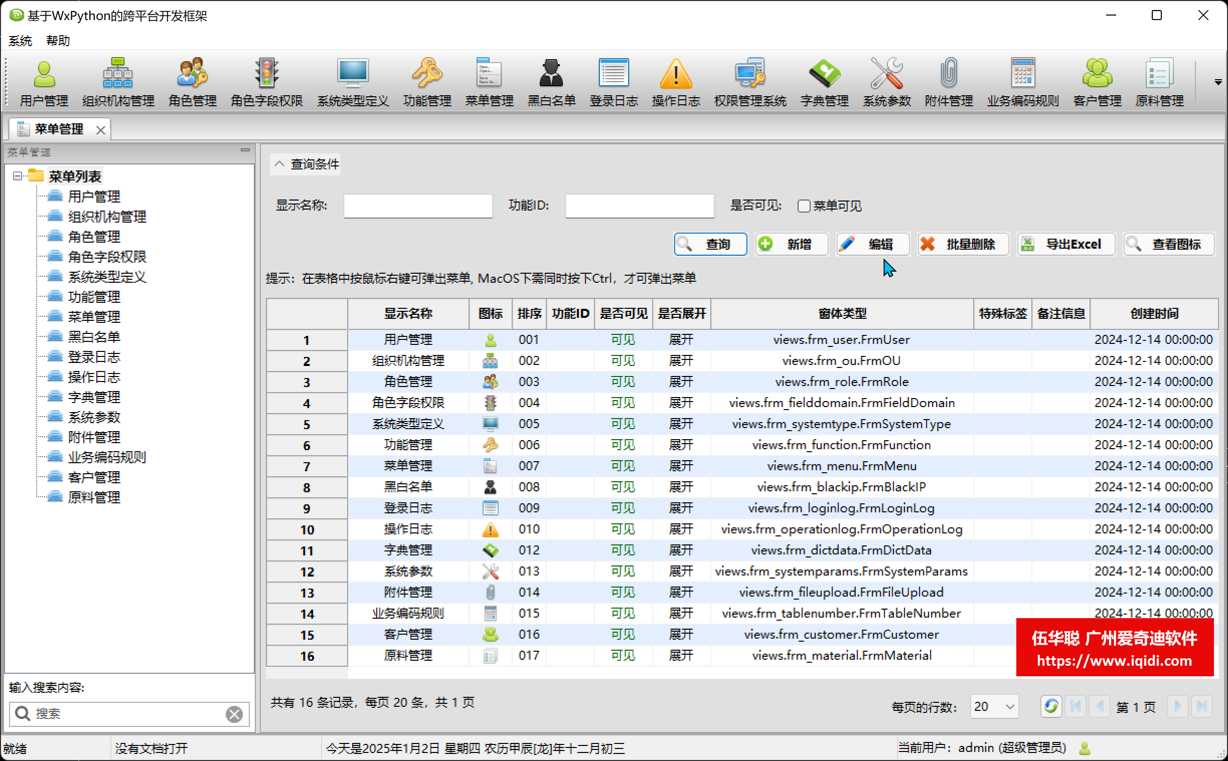 在一个业务管理系统中,如果我们需要实现权限控制功能,我们需要定义好对应的权限功能点,然后在前端界面中对界面元素的可用性和功能点进行绑定,这样就可以在后台动态分配权限进行动态控制了,一般来说,权限功能点是针对角色进行控制的,也就是简称RBAC(Role Based Access Control)。对于登录系统后的用户,对用户的菜单(工具栏)、界面操作按钮的权限进行动态化的绑定和统一处理的操作过程,这样对于我们界面,只需要约定一些规则即可实现比较弹性化的操作,非常方便。本篇随笔介绍WxPython跨平台开发框架之动态菜单的管理和功能权限的控制。