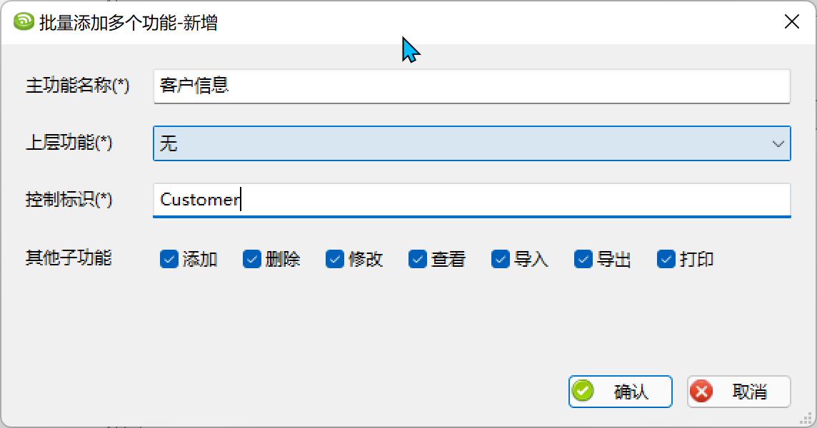 我们为了方便,在开始的时候,创建功能点的时候,一般通过批量添加的方式快速添加,如下界面所示。