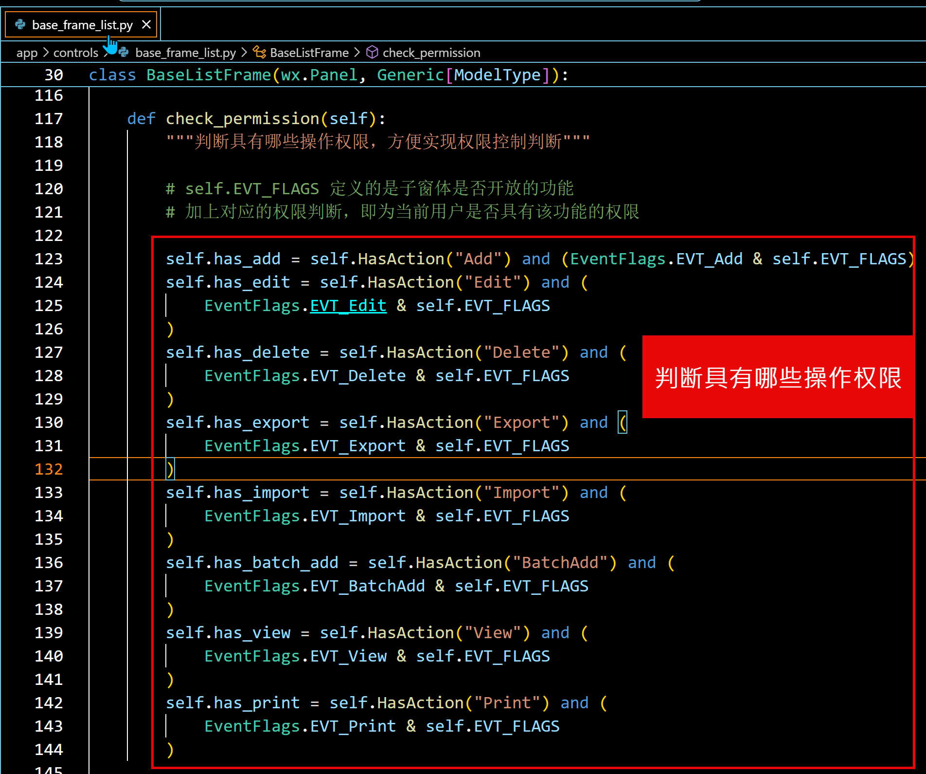 在BaseListFrame类里面,我们定义一个判断是否有对应功能点的函数,如下所示。